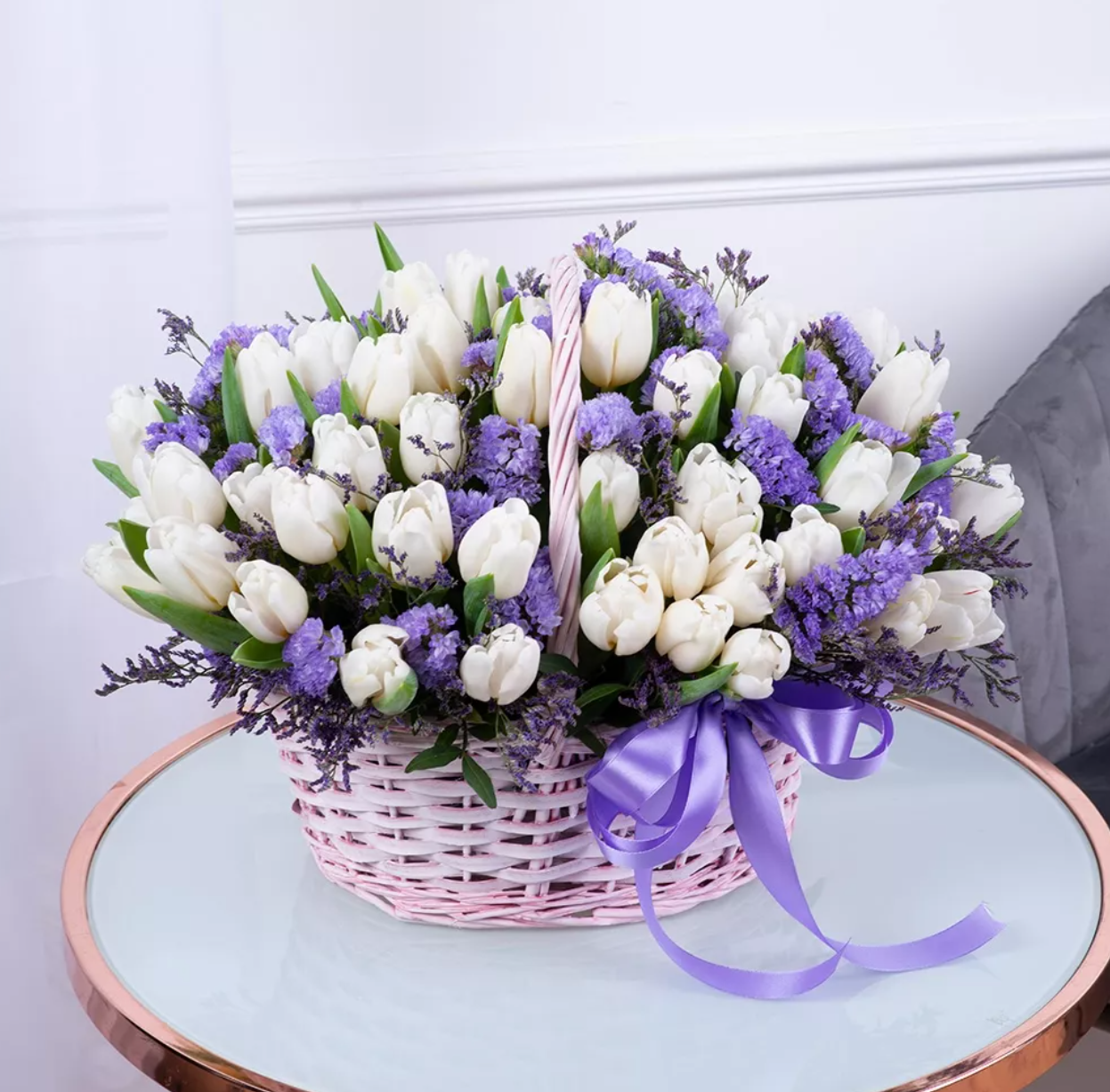 Be the first to review “Timeless Harmony: 70 Tulips with Statice in a Basket”